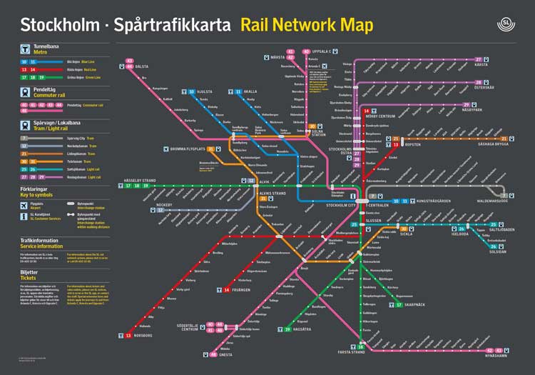 Le métro (tunnelbana) est le mode de transport le plus rapide et le plus simple à utiliser. Il est composé de 3 lignes (bleue, rouge et verte) qui se séparent chacune en 2 ou 3 branches et qui se croisent toutes à la station de métro centrale, T-Centralen. Le métro circule entre 5h et 1h en semaine et 24h/24 le week-end c'est-à-dire toute la nuit du vendredi au samedi et toute la nuit du samedi au dimanche.Carte du métro, du tram et des trains de banlieue de Stockholm (cliquer sur la carte pour l'agrandir)