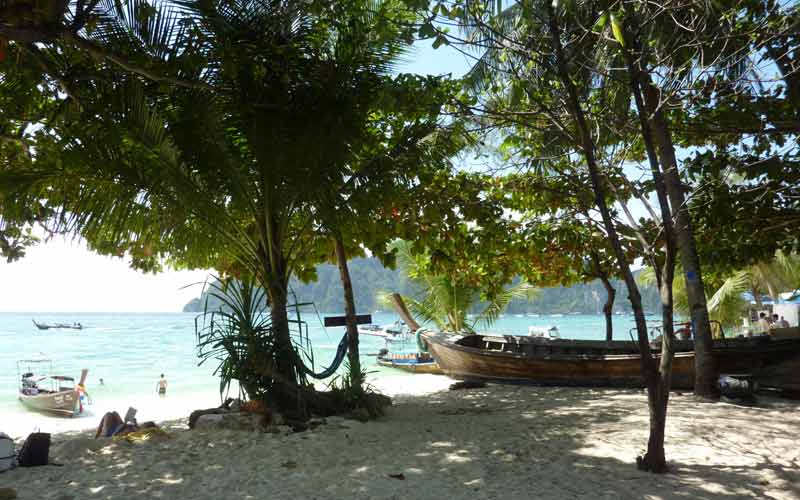 Une fois arrivés, vous profiterez d’un véritable décor de carte postale ! Quelques karsts en pierre calcaire (dont l'un des points de repère de Phi Phi Don : le Camel Rock) font saillie sur la mer juste en face de la plage, ce qui ajoute à l'aspect exotique de l'ensemble.