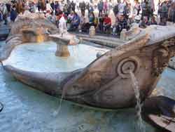 Au pied de l’escalier, la fontaine de la Barcaccia représente une barque en train de couler. Elle est l’œuvre du père du Bernin qui avait conçu la fontaine sous le niveau de la rue afin de pallier au manque de pression d'eau.