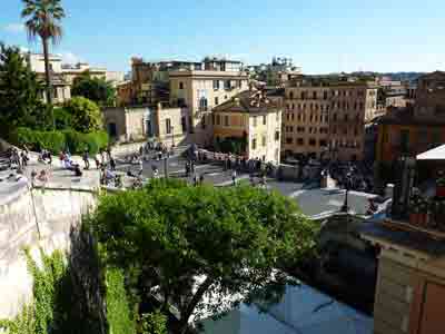 La piazza di Spagna est l’une des places les plus célèbres de Rome. Nommée ainsi au XVIIème siècle lorsque l’ambassade d’Espagne s’y installa, c’est un endroit particulièrement prisé des touristes qui viennent s’asseoir sur le fameux escalier de la Trinité-des-Monts (scalinata della Trinità dei Monti) pour observer la foule.Au pied de l’escalier, la fontaine de la Barcaccia représente une barque en train de couler. Elle est l’œuvre du père du Bernin qui avait conçu la fontaine sous le niveau de la rue afin de pallier au manque de pression d'eau.